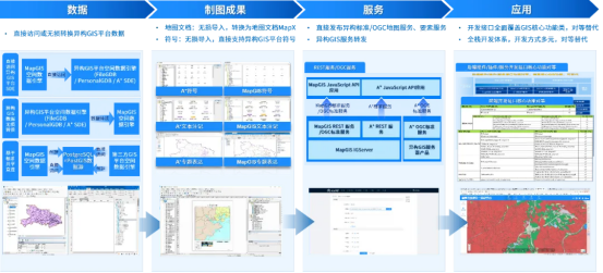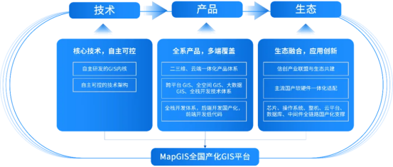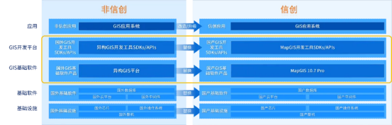 MapGIS 打造了从基础设施、基础软件到GIS基础软件、GIS开发平台到应用开发的全链路国产化替代能力,既能实现国外基础设施、基础软件、GIS产品向国产体系的全面替换,又能充分利用历史成果,保障业务不中断。